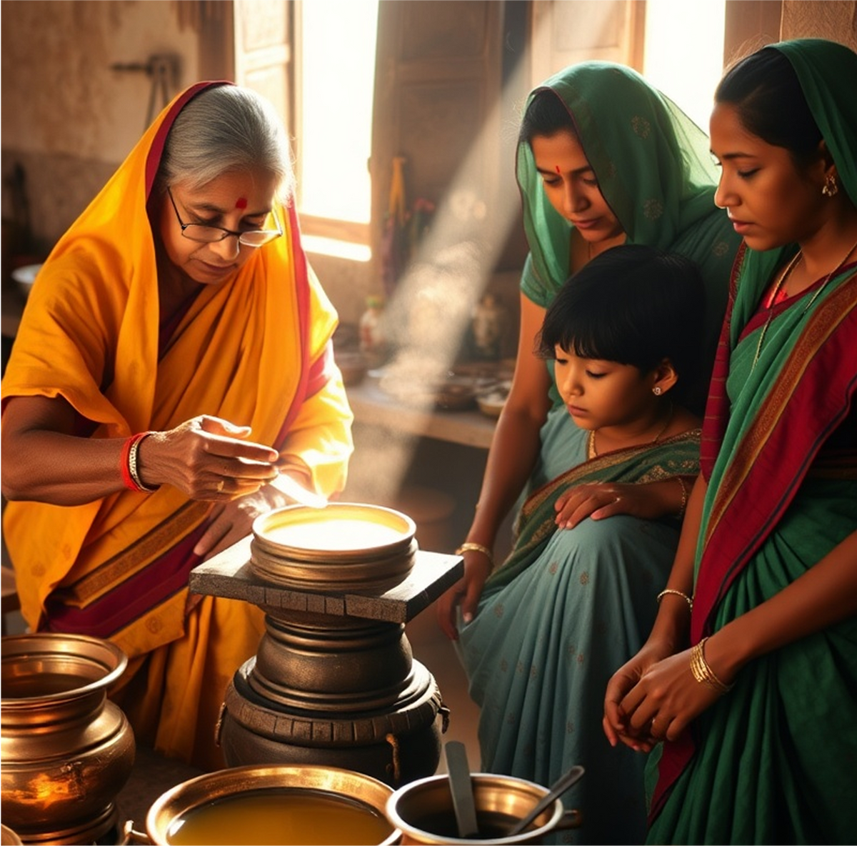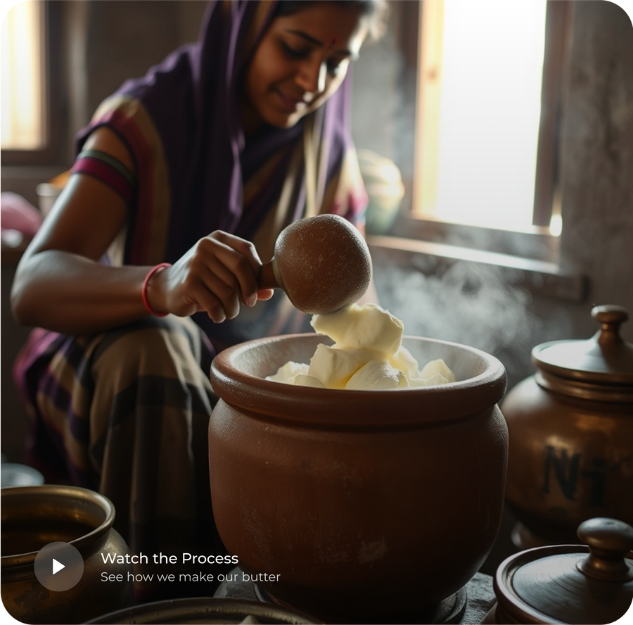 For generations, our family has preserved the ancient art of ghee- making, passing down the wisdom of the Vedic Bilona method from one generation to the next.