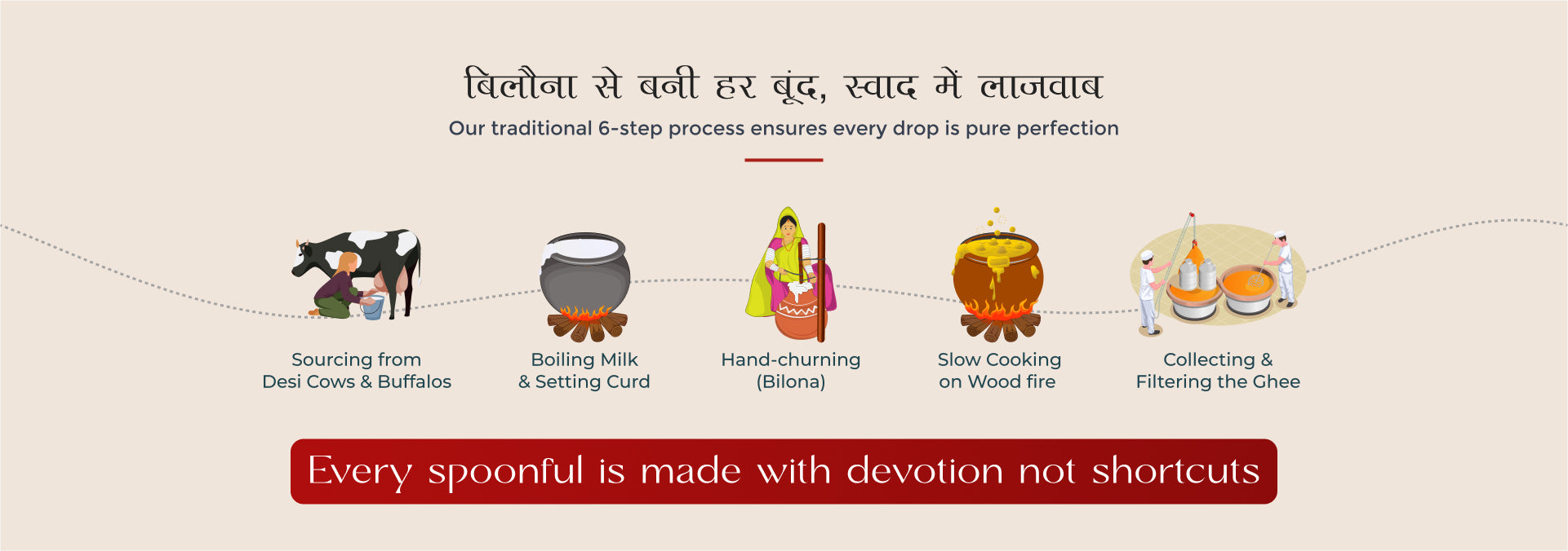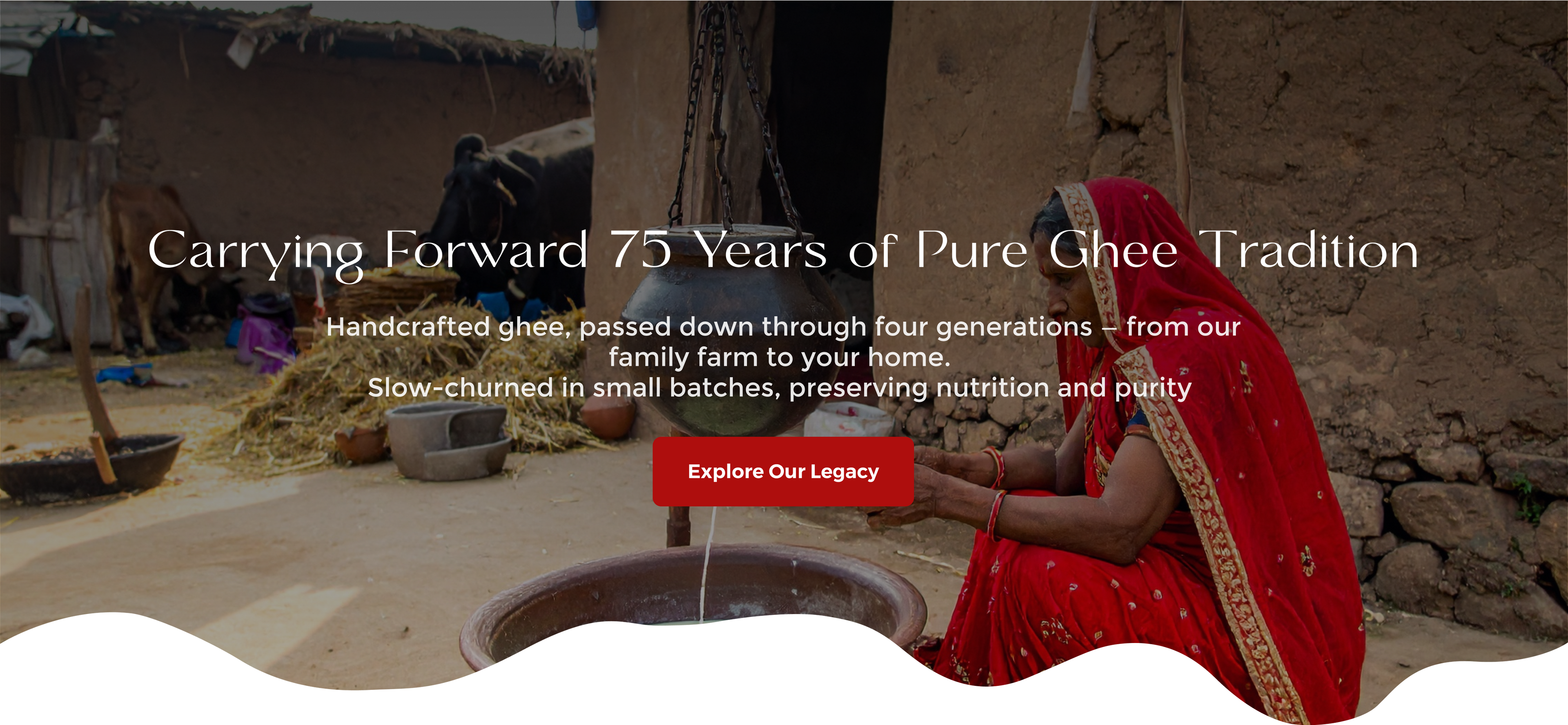 By staying true to the bilona method and sourcing pure milk with care, we aim to deliver ghee that is authentic, nourishing, and trustworthy. Our vision is to keep this tradition alive in a way that fits modern lifestyles, making ghee not only a part of every kitchen but also a source of health, happiness, and togetherness for families in India and across the world.
