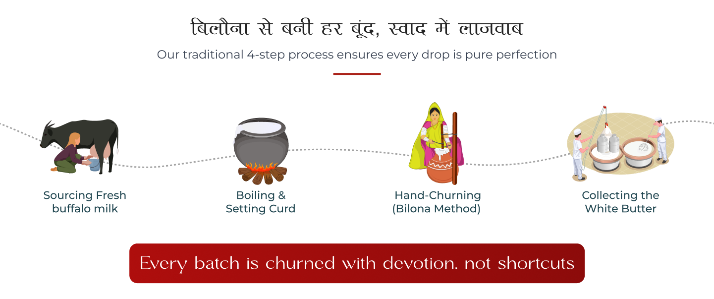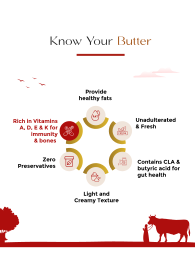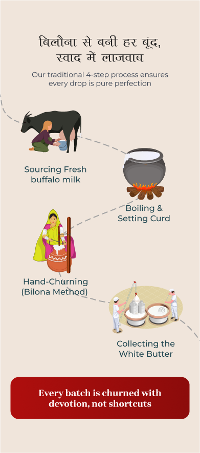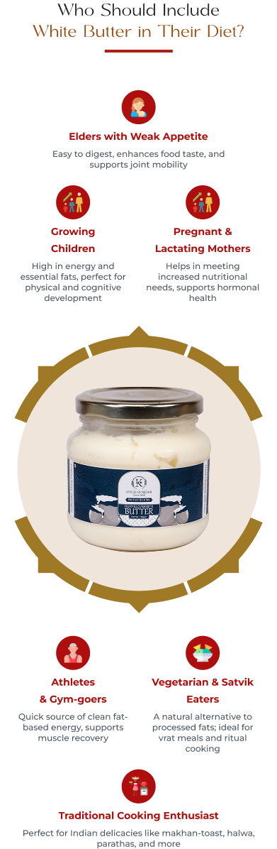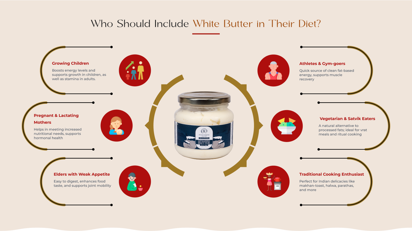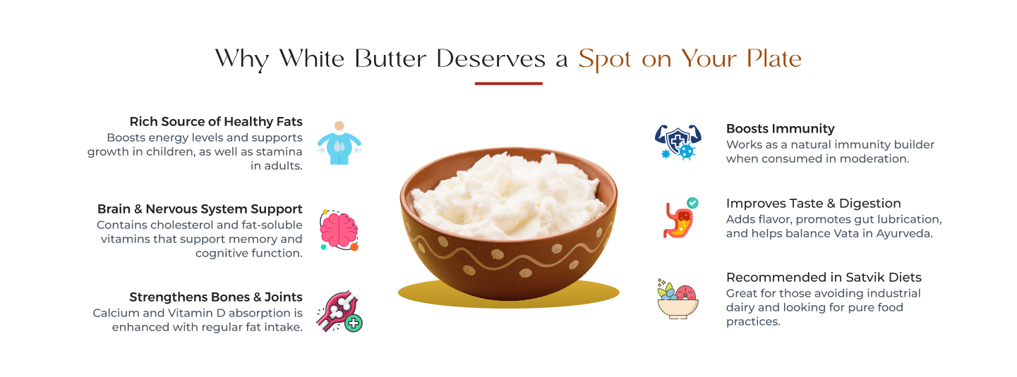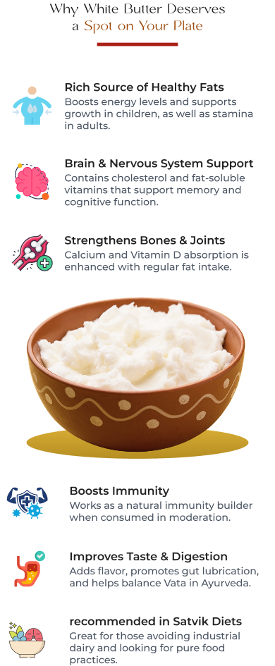Unlike processed table butter, our white butter is hand-churned using traditional methods from fresh curd, not cream. It is free from stabilizers, emulsifiers, or added salt, and has a soft, creamy texture that melts beautifully.